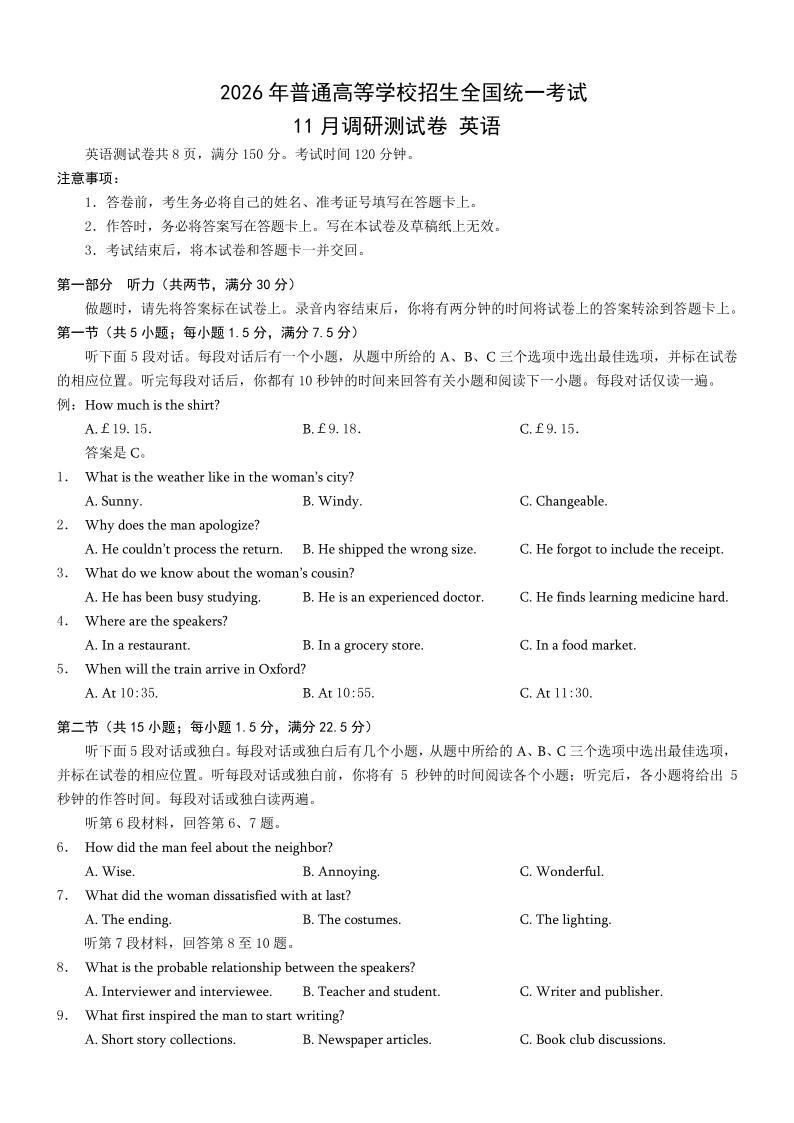 重庆市普通高中学业水平选择性考试11月调研测试卷 英语试题(含答案).pdf