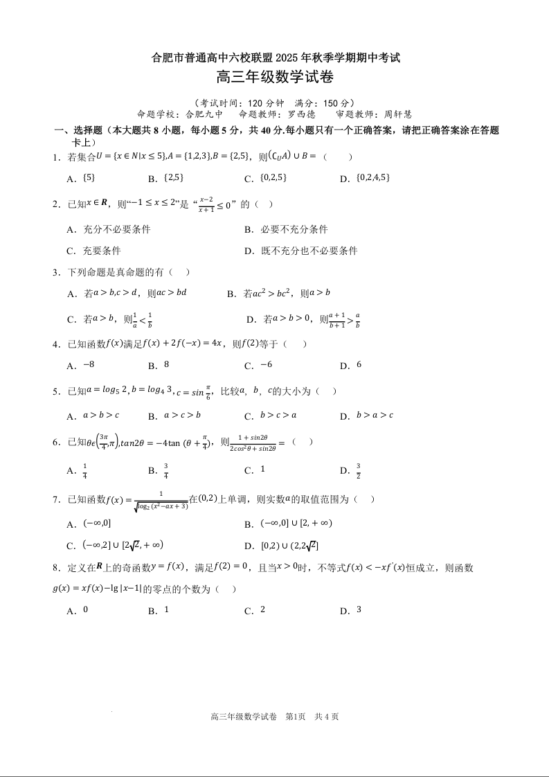 合肥市普通高中六校联盟2025年秋季学期期中考试 数学.docx