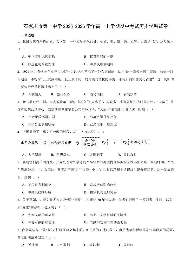 河北省石家庄市第一中学2025-2026学年高一上学期期中考试 历史试题(含答案).docx