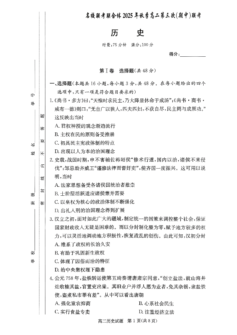 湖南省炎德英才名校联考联合体2025年秋季高二第三次(期中)联考 历史.pdf