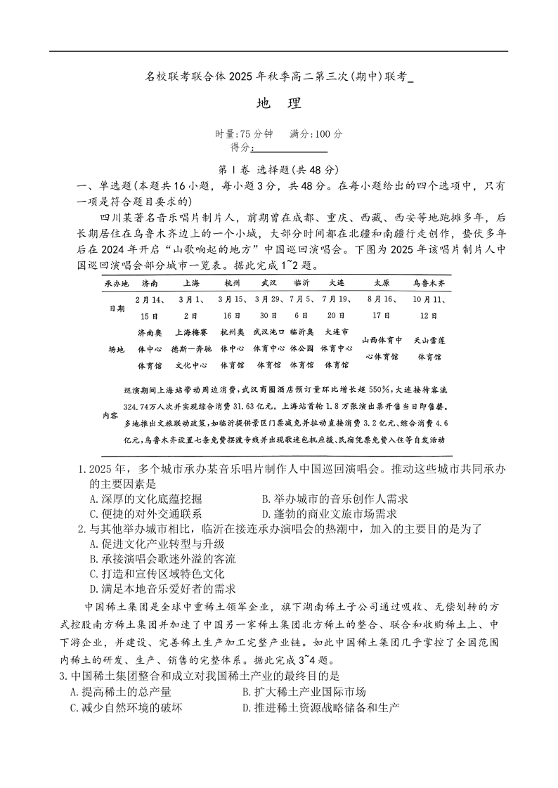 湖南省炎德英才名校联考联合体2025年秋季高二第三次(期中)联考 地理.pdf