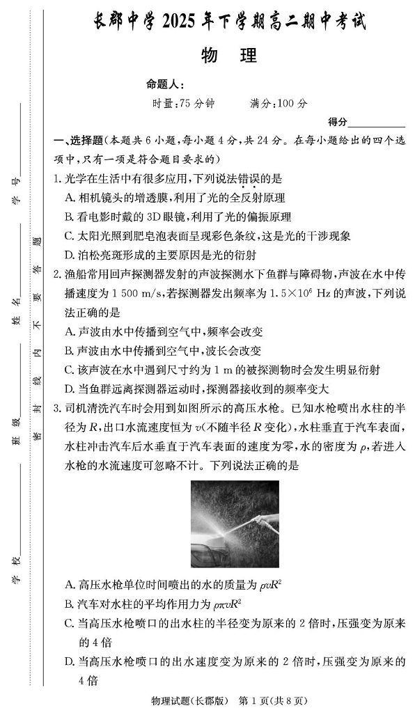 湖南省长沙市长郡中学2025年下学期高二11月期中考试 物理试题(含答案).pdf