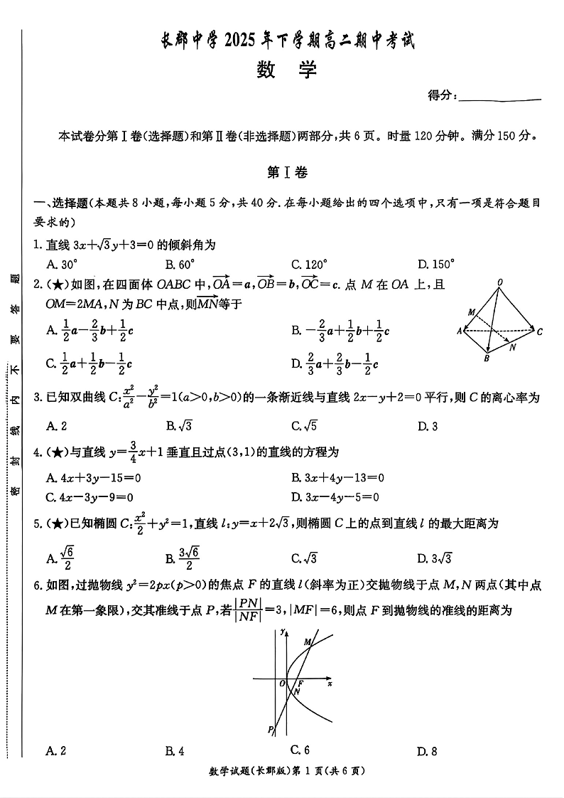 湖南省长沙市长郡中学2025年下学期高二11月期中考试 数学试题(含答案).pdf