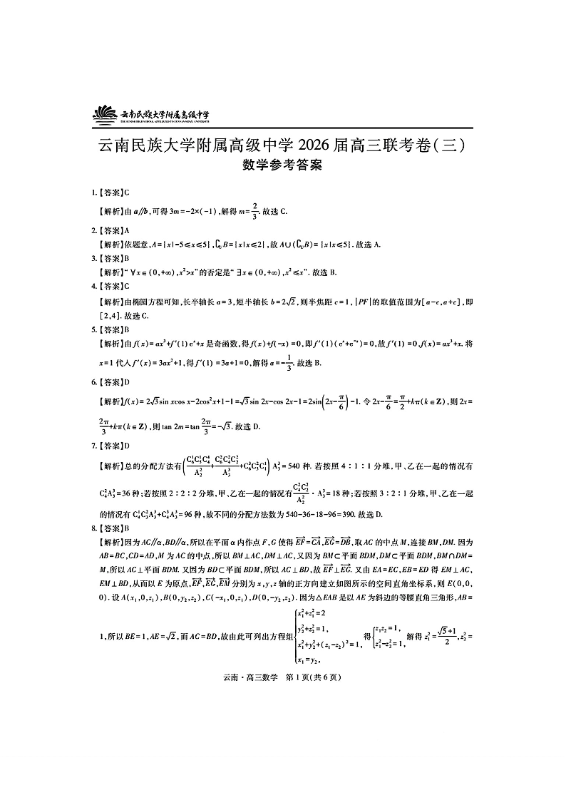 云南民族大学附属高级中学2026届高三联考卷(三)数学答案.pdf