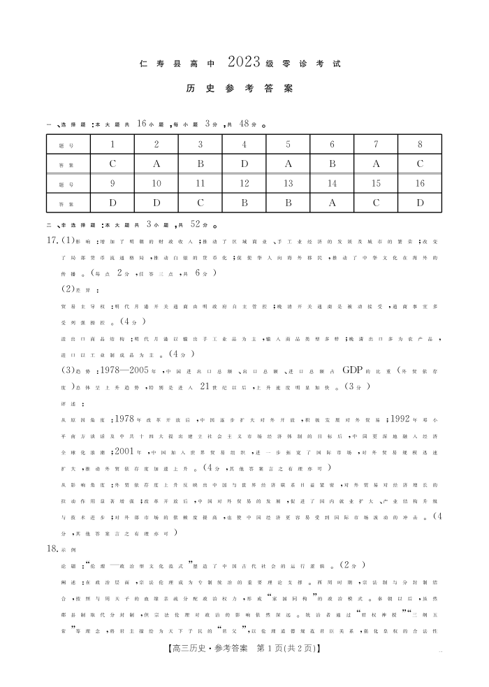 四川省仁寿县高中2023级零诊考试 历史答案.pdf