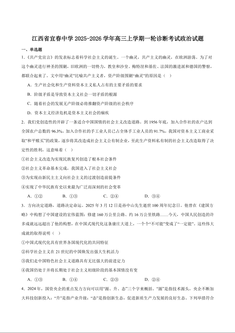 江西省宜春中学2026届高三上学期一轮诊断考试 政治试题(含答案).docx