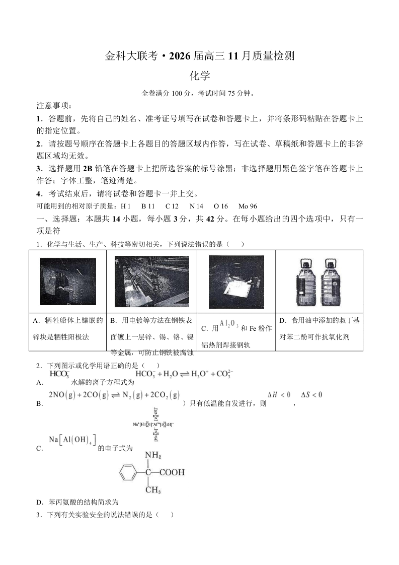 河北省金科大联考2026届高三上学期11月期中质量检测考试 化学试题(含答案).docx