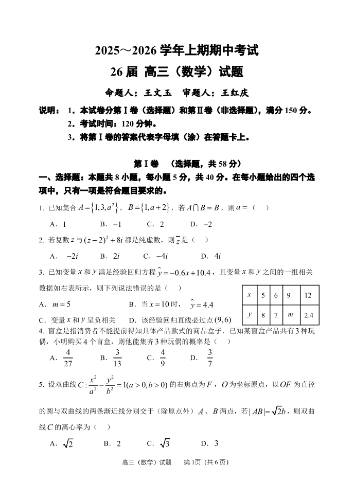 郑州市第一中学2025-2026学年高三上学期期中考试 数学.pdf