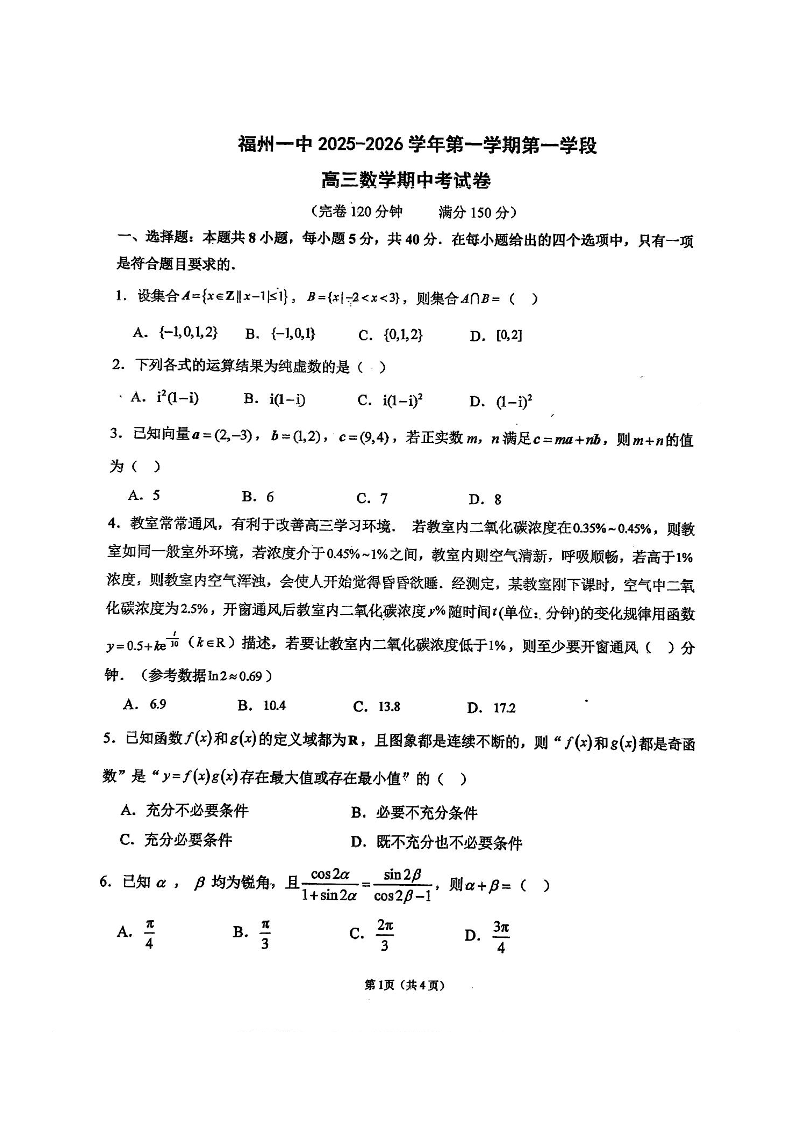 福州市第一中学2025-2026学年第一学期第一学段模块考试 数学试题(含答案).pdf