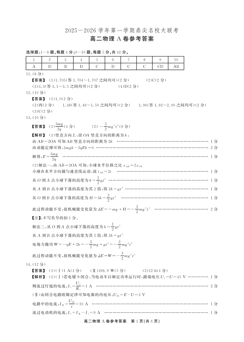【物理A卷答案】安徽省鼎尖名校大联考2025-2026学年上学期高二11月期中考试.pdf
