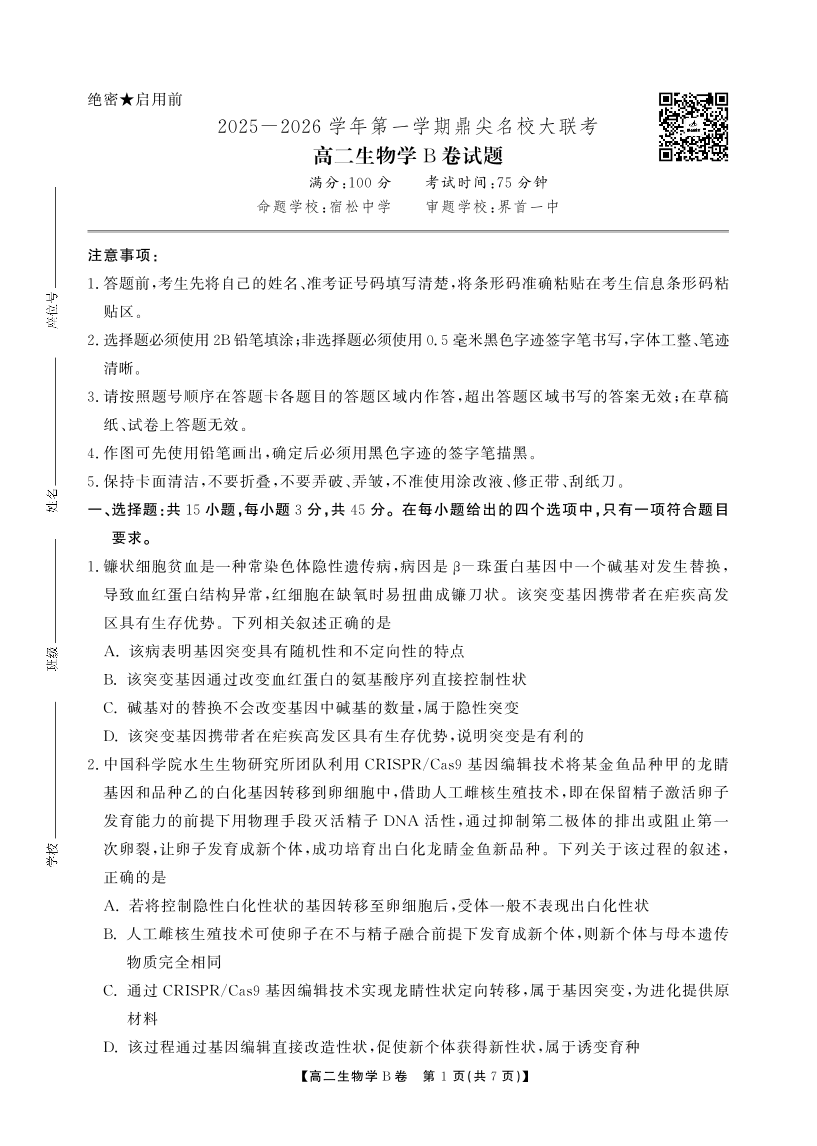 【生物B卷】安徽省鼎尖名校大联考2025-2026学年上学期高二11月期中考试.pdf