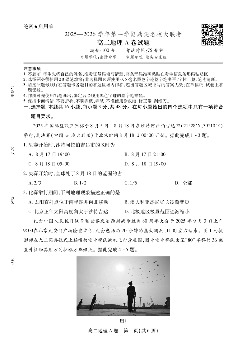 【地理A卷】安徽省鼎尖名校大联考2025-2026学年上学期高二11月期中考试.pdf