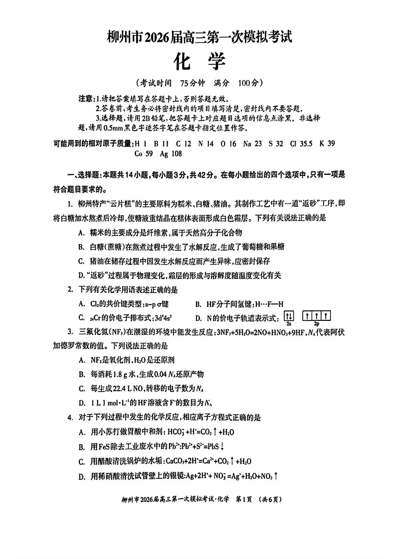 广西柳州市2026届高三第一次模拟考试化学.pdf