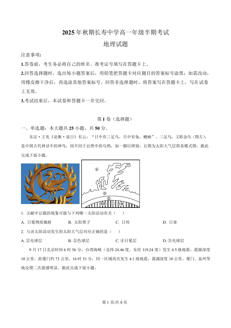 重庆市长寿中学2025-2026学年高一上学期11月期中考试 地理.docx