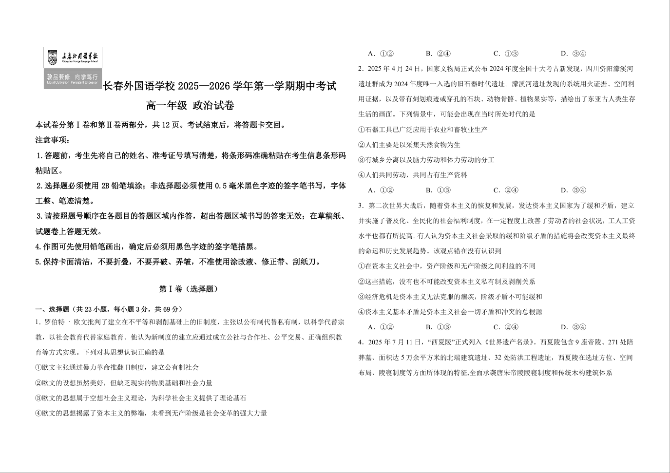 吉林省长春外国语学校2025-2026学年高一上学期期中考试 政治试题(含答案).docx