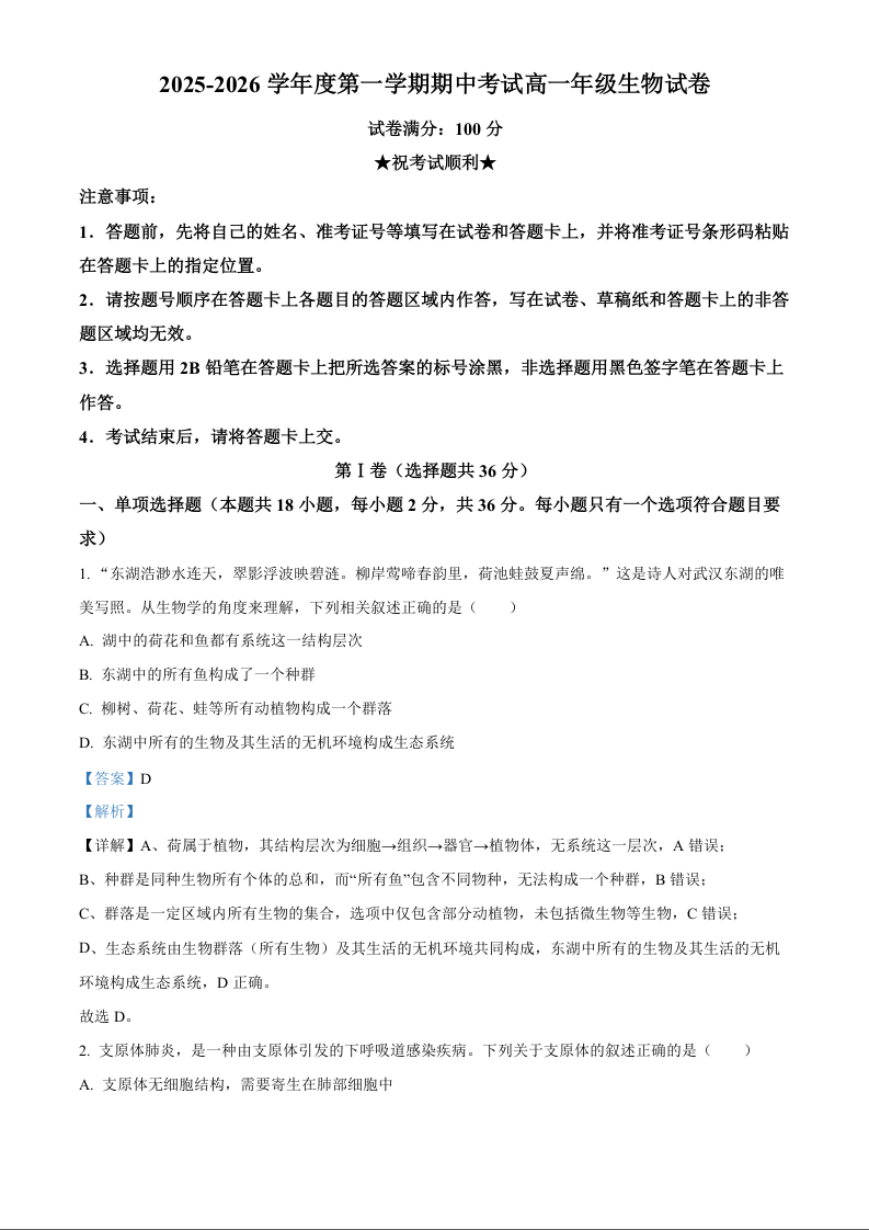 湖北省武汉市东湖高新区2025-2026学年高一上学期期中考试 生物答案.docx
