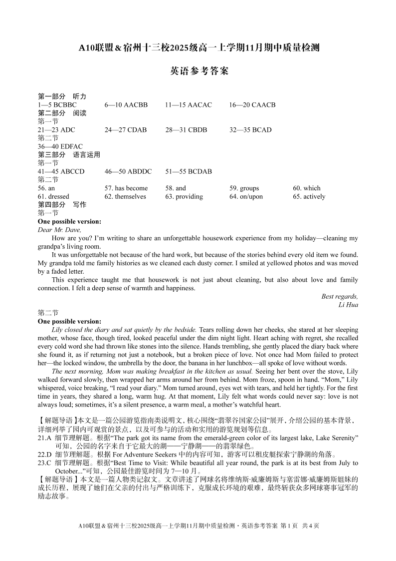 【英语答案】A10联盟&宿州十三校2025级高一上学期11月期中质量检测英语答案.pdf