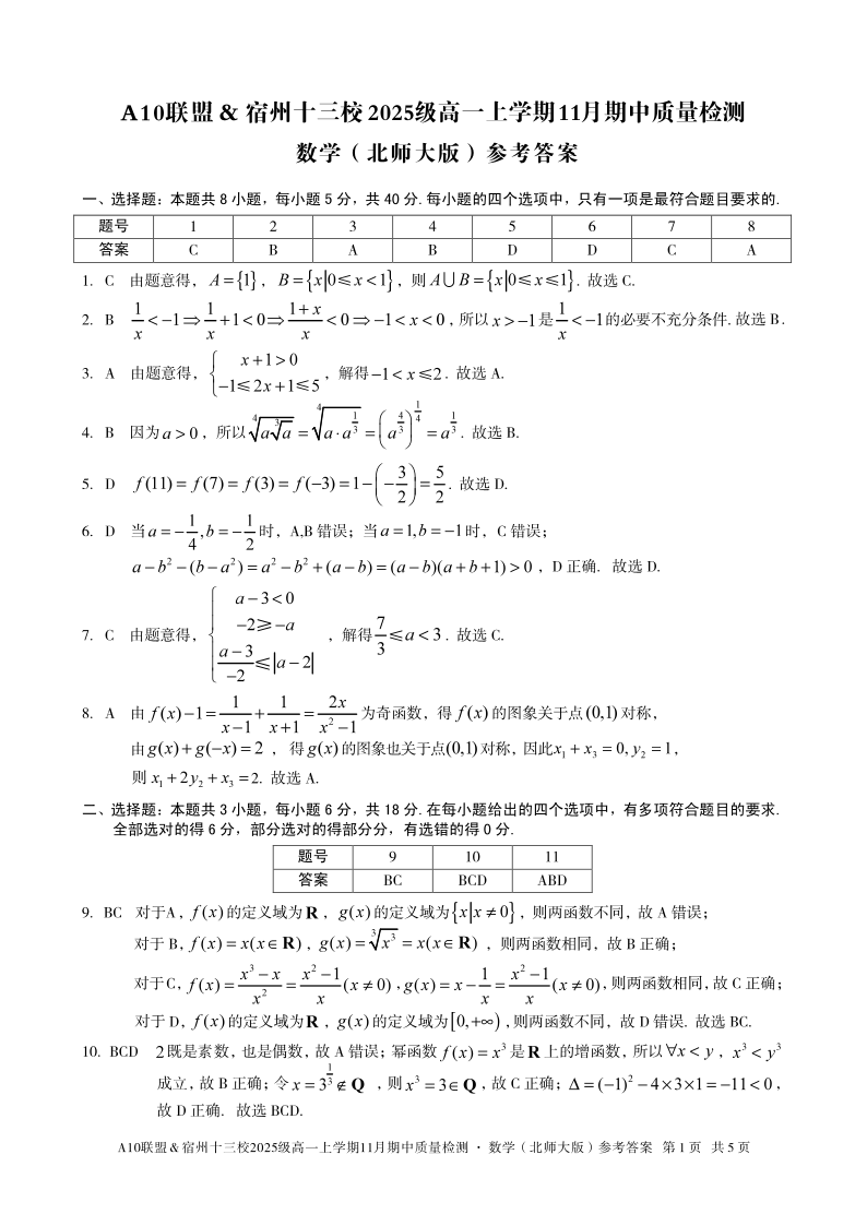 【数学答案】A10联盟&宿州十三校2025级高一上学期11月期中质量检测数学(北师大版)答案.pdf