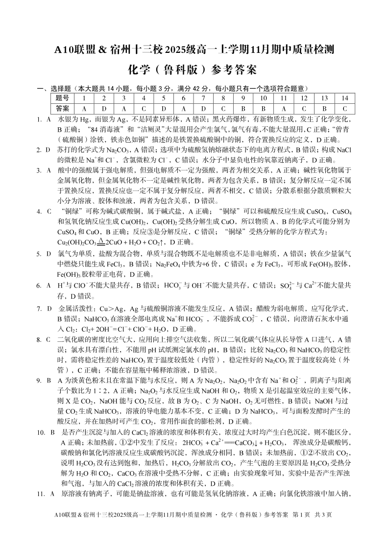 【化学答案】A10联盟&宿州十三校2025级高一上学期11月期中质量检测化学(鲁科版)答案.pdf