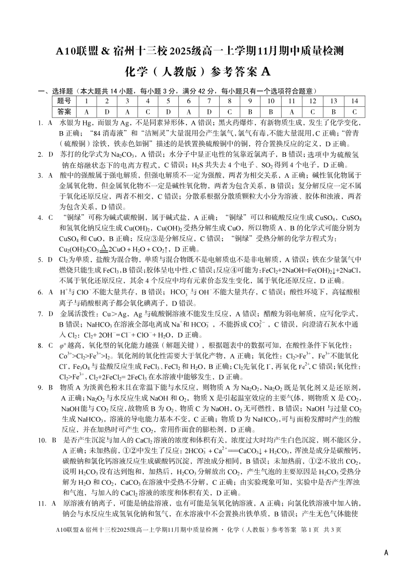 【化学答案】(A卷)A10联盟&宿州十三校2025级高一上学期11月期中质量检测化学(人教版)答案a.pdf