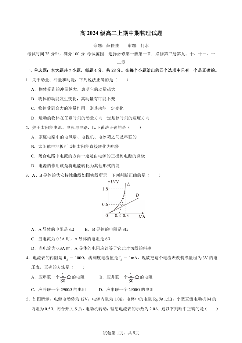 重庆市万州二中2025-2026学年高二上学期期中考试 物理.docx