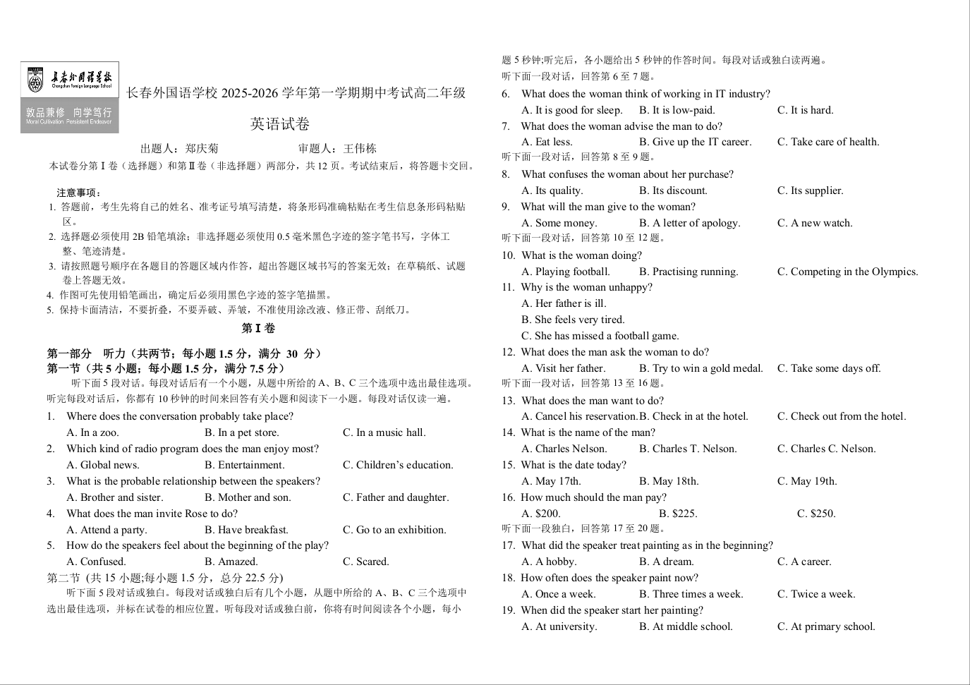 吉林省长春外国语学校2025-2026学年高二上学期期中考试 英语试题(含答案).docx