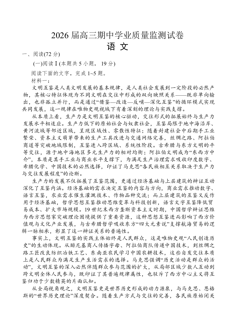 江苏省南通市海安市2026届高三年级上学期期中学业质量监测 语文试卷(含答案).docx