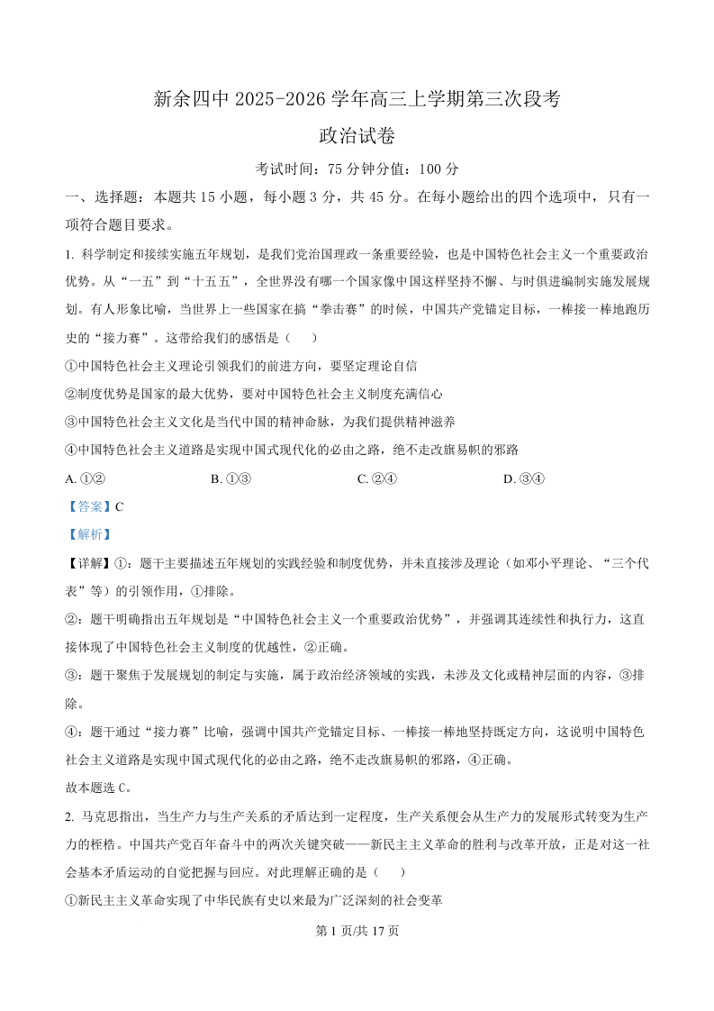 江西省新余市第四中学2026届高三上学期11月第三次段考 政治答案.docx
