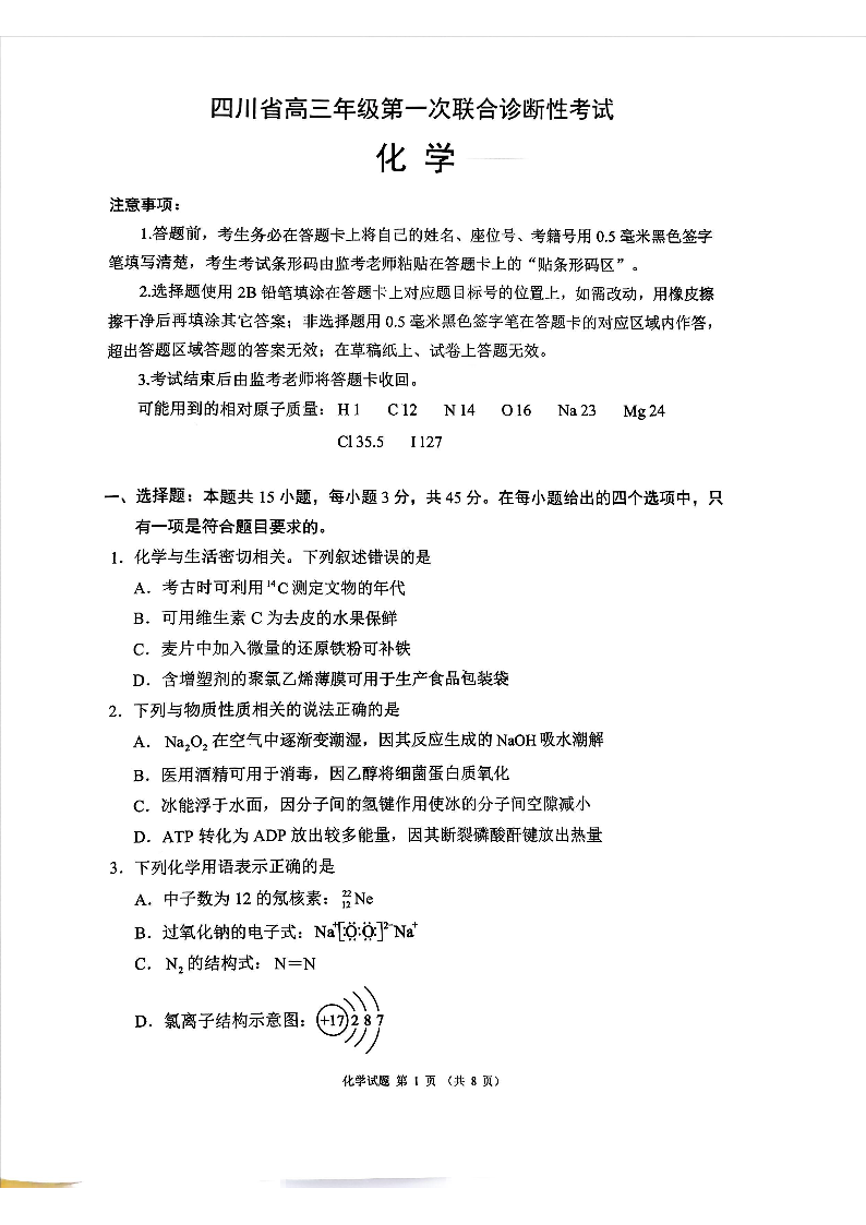 四川省蓉城名校联盟2026届高三第一次联合诊断性考试 化学.pdf