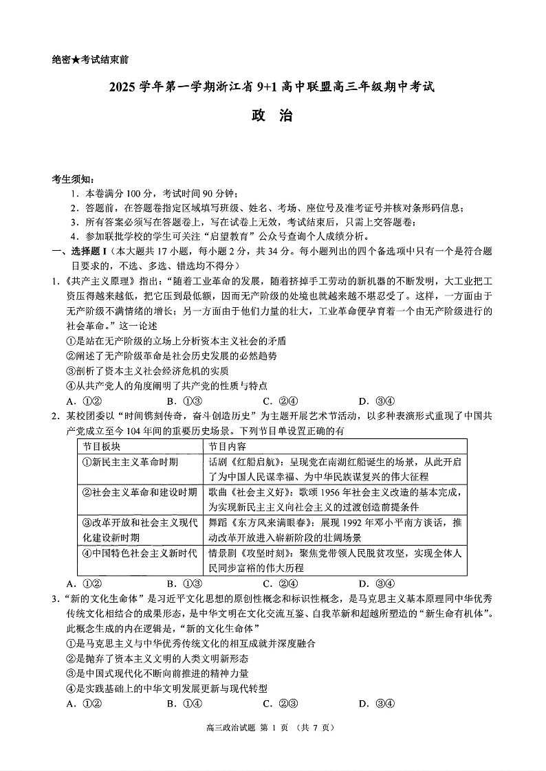 浙江省9+1高中联盟2025学年第一学期高三年级期中考试 政治.pdf