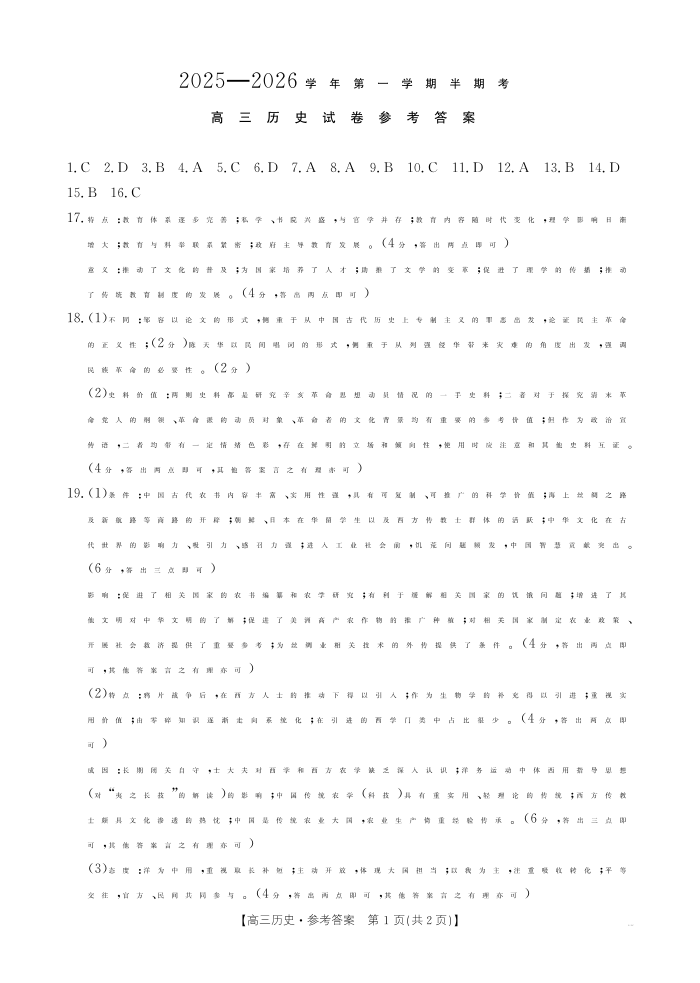 福建省2025-2026学年第一学期半期考 历史答案.pdf
