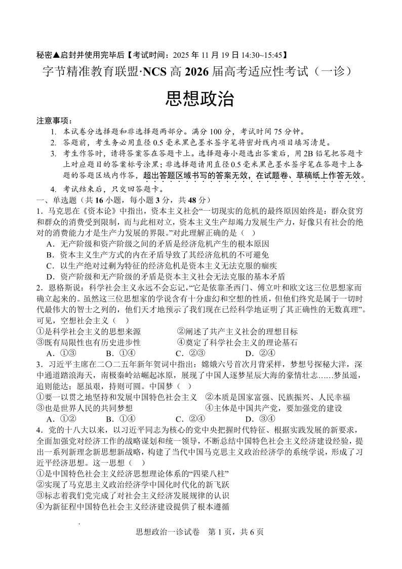 字节精准教育联盟·NCS高2026届高考适应性考试(一诊)政治.pdf