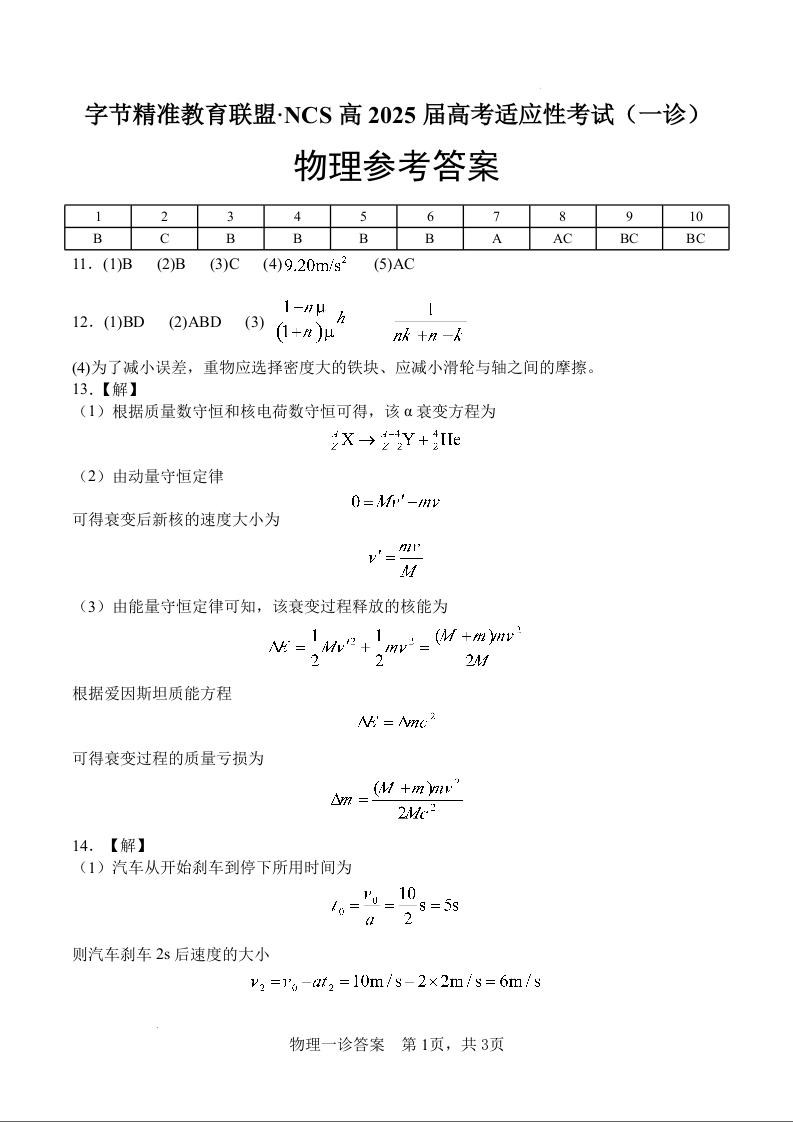 字节精准教育联盟·NCS高2026届高考适应性考试(一诊)物理答案.docx
