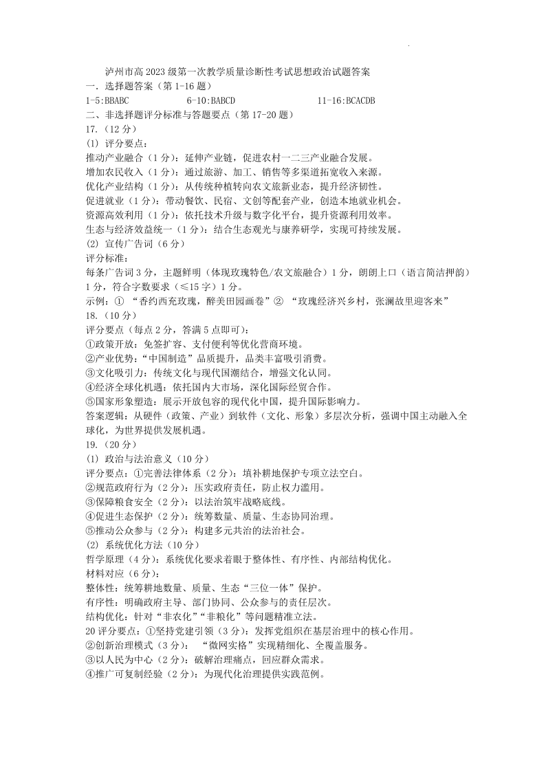 泸州市高2023级第一次教学质量诊断性考试 政治答案.pdf