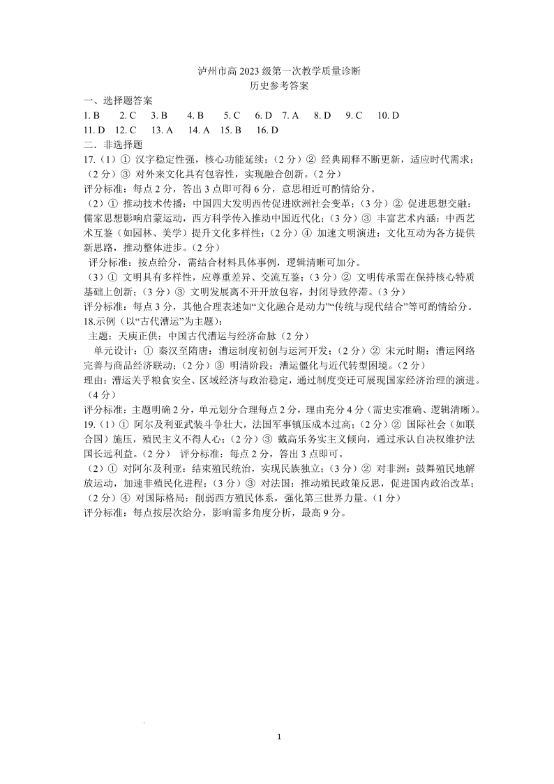 泸州市高2023级第一次教学质量诊断性考试 历史答案.pdf