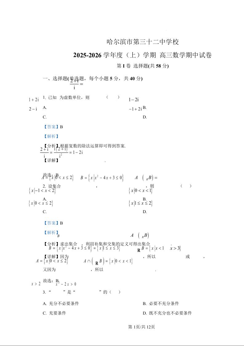 黑龙江省哈尔滨市第三十二中学校2026届高三上学期11月期中考试 数学答案.docx
