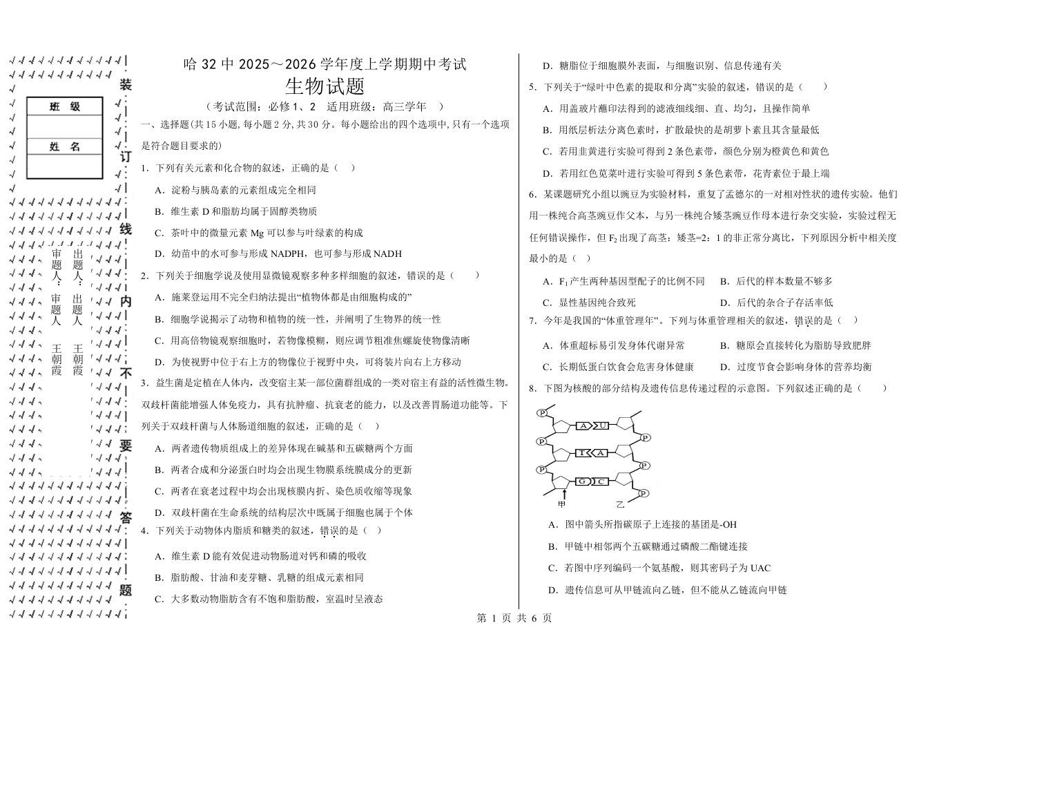 黑龙江省哈尔滨市第三十二中学校2026届高三上学期11月期中考试 生物试题(含答案).docx