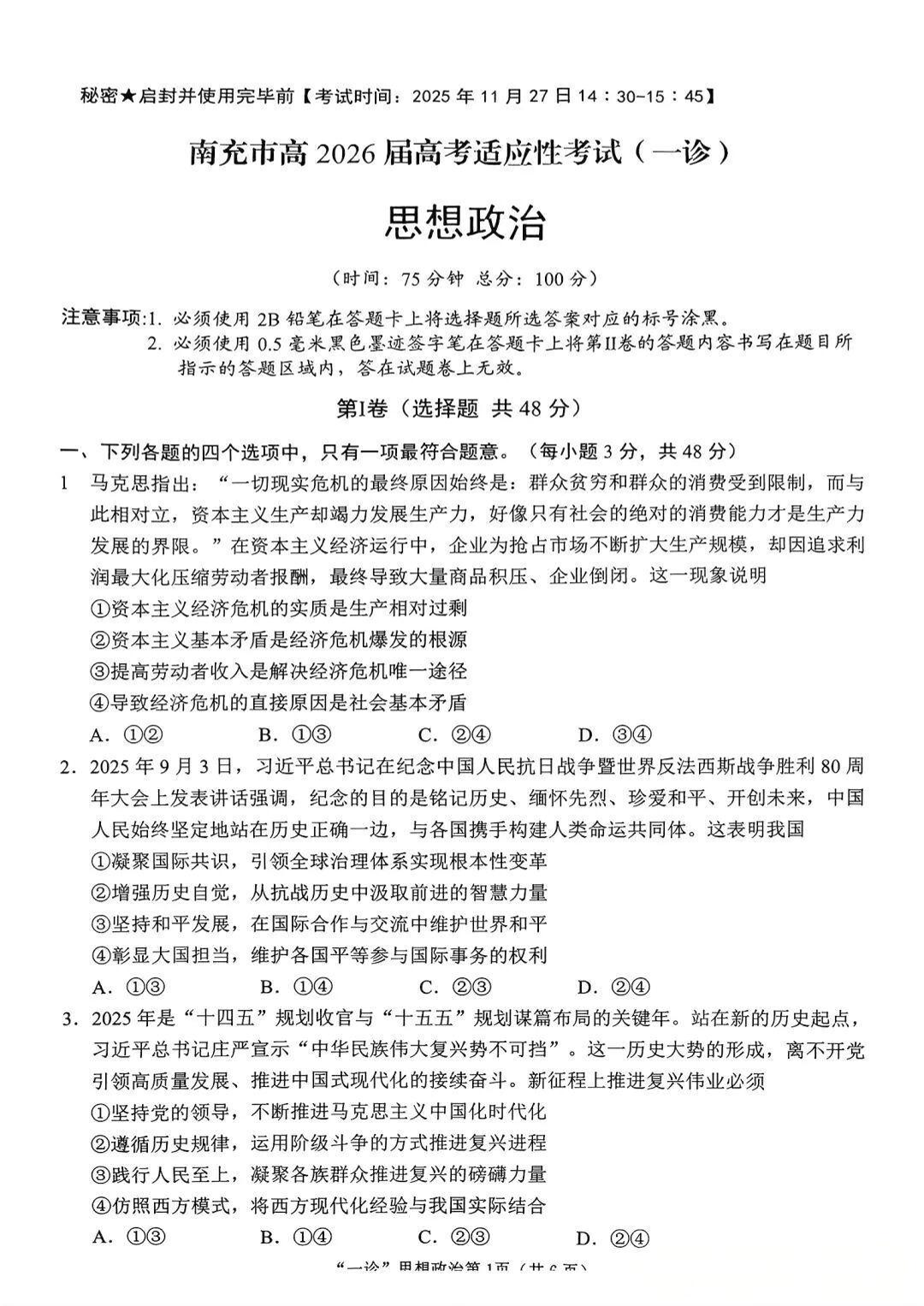 南充市高2026届高考适应性考试(一诊)政治.pdf