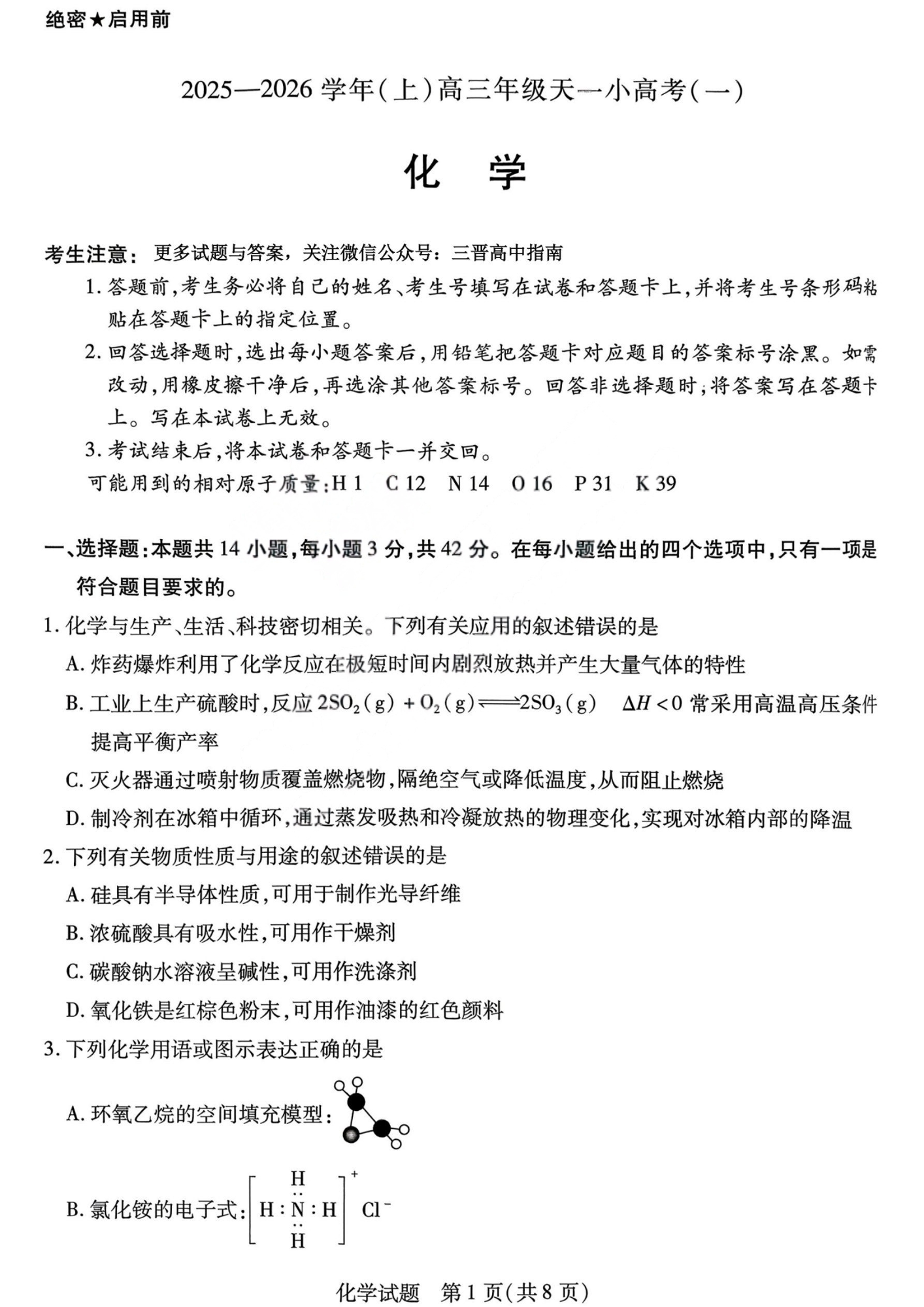 山西省天一大联考2025-2026学年(上)高三年级天一小高考(一) 化学.pdf
