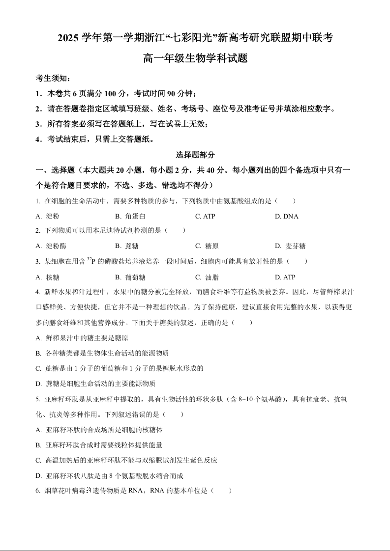 浙江省“七彩阳光”新高考研究联盟2025-2026学年高一上学期期中联考 生物.docx