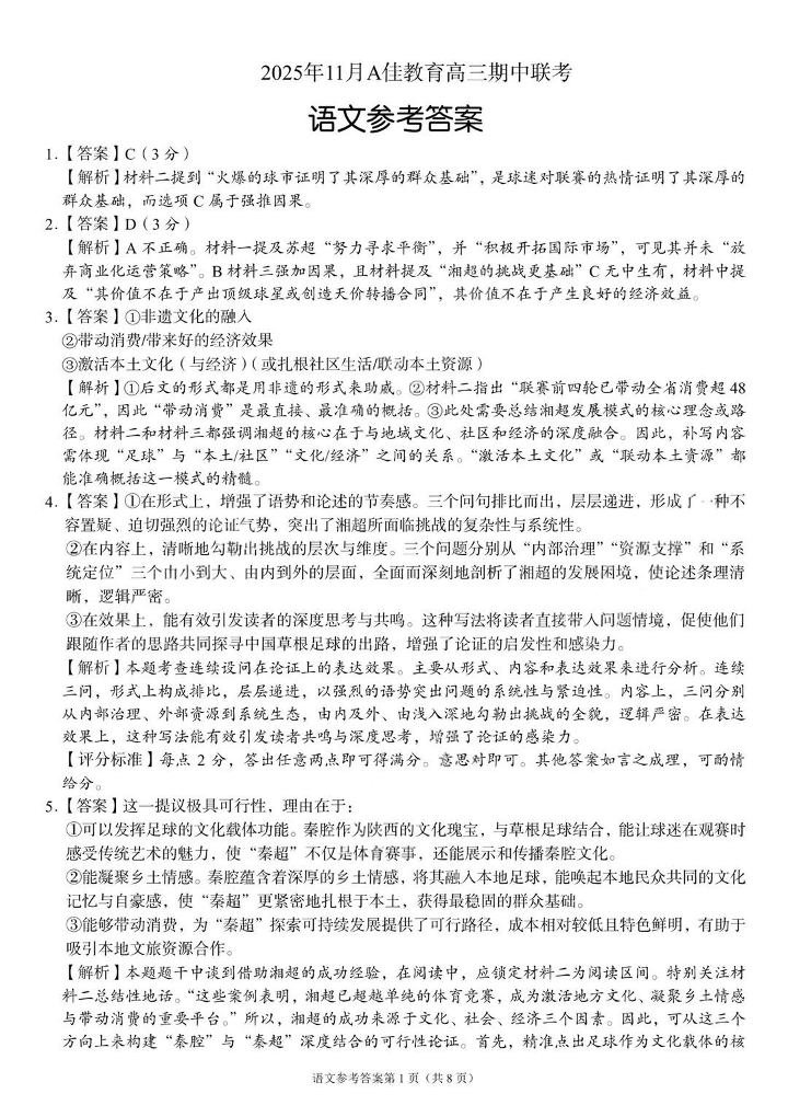 2025年11月A佳教育高三期中联考 语文答案.pdf