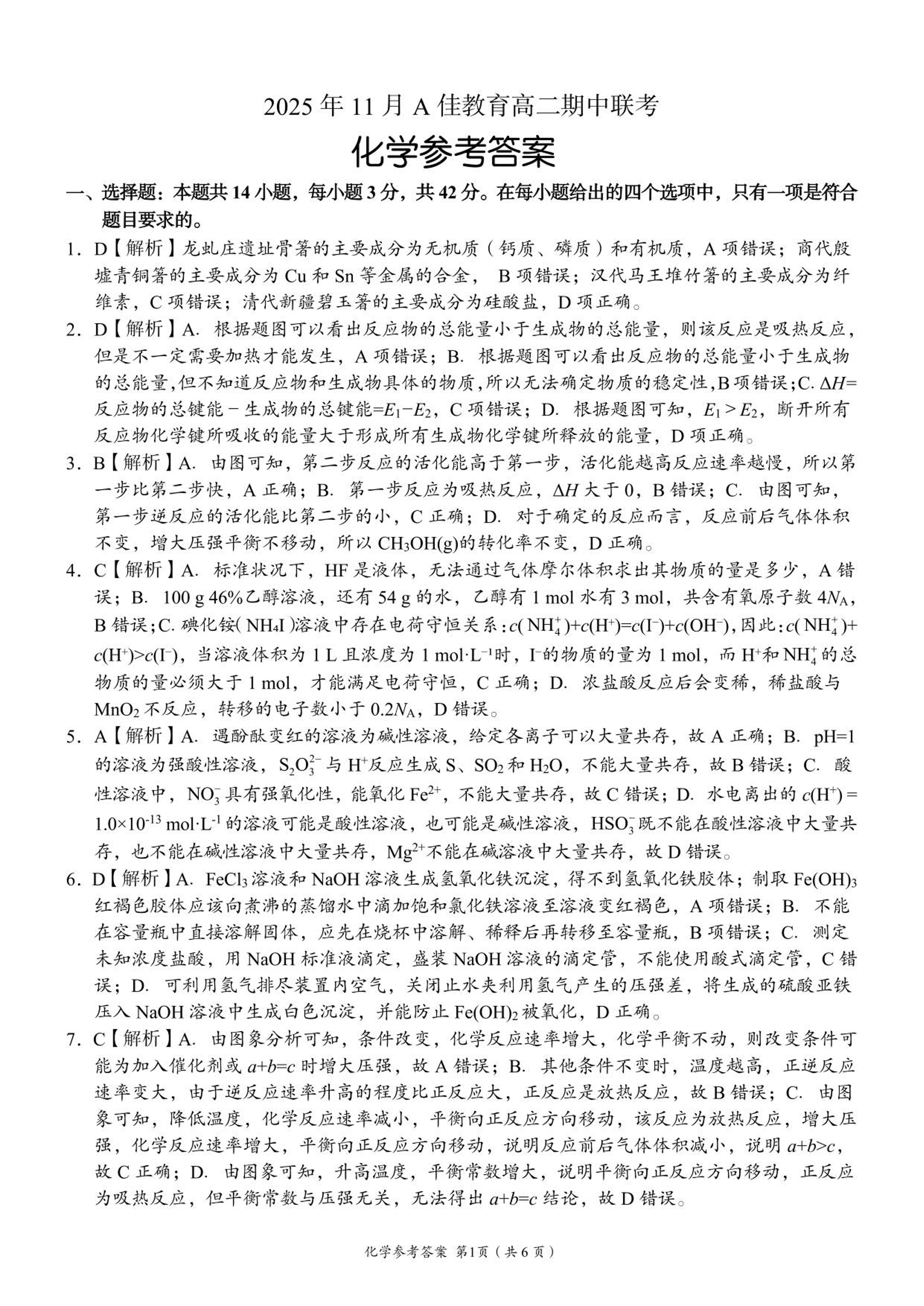 2025年11月A佳教育高二期中联考 化学答案.pdf
