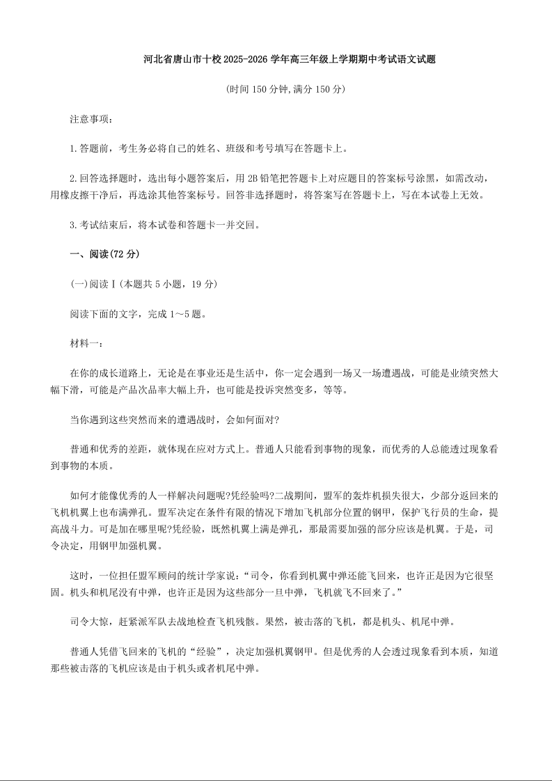 河北省唐山市十校2025-2026学年高三年级上学期期中考试 语文试题(含答案).docx