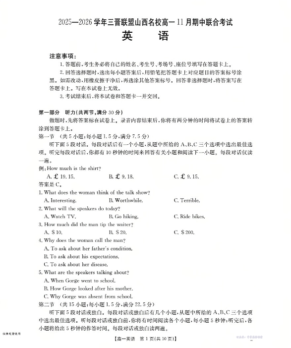 山西省三晋联盟山西名校2025-2026学年高一上学期11月期中联合考试 英语.pdf