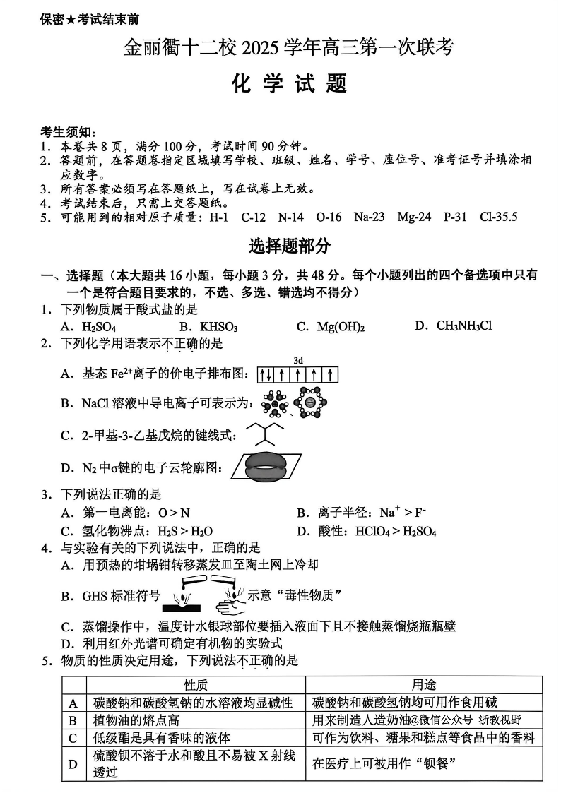 金丽衢十二校2025学年高三第一次联考 化学.pdf