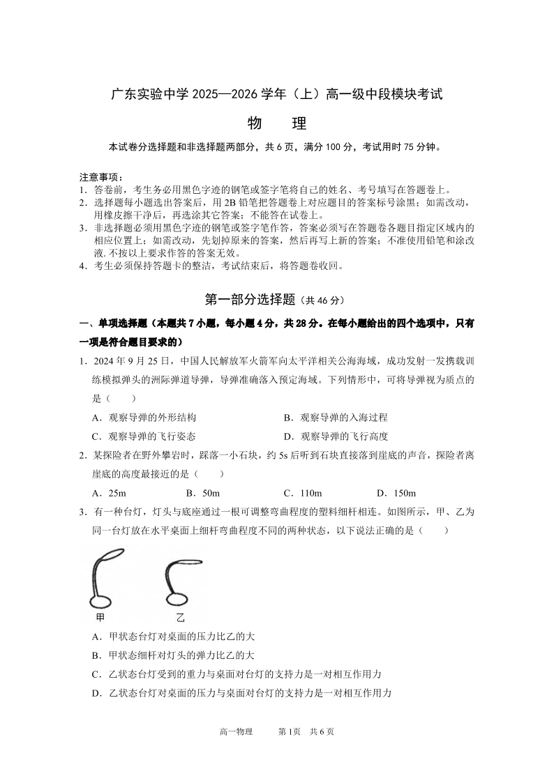 广东省实验中学2025-2026学年高一上学期期中考试 物理.pdf