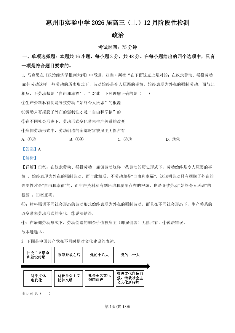 广东省惠州市实验中学2026届高三上学期12月阶段性检测 政治答案.docx