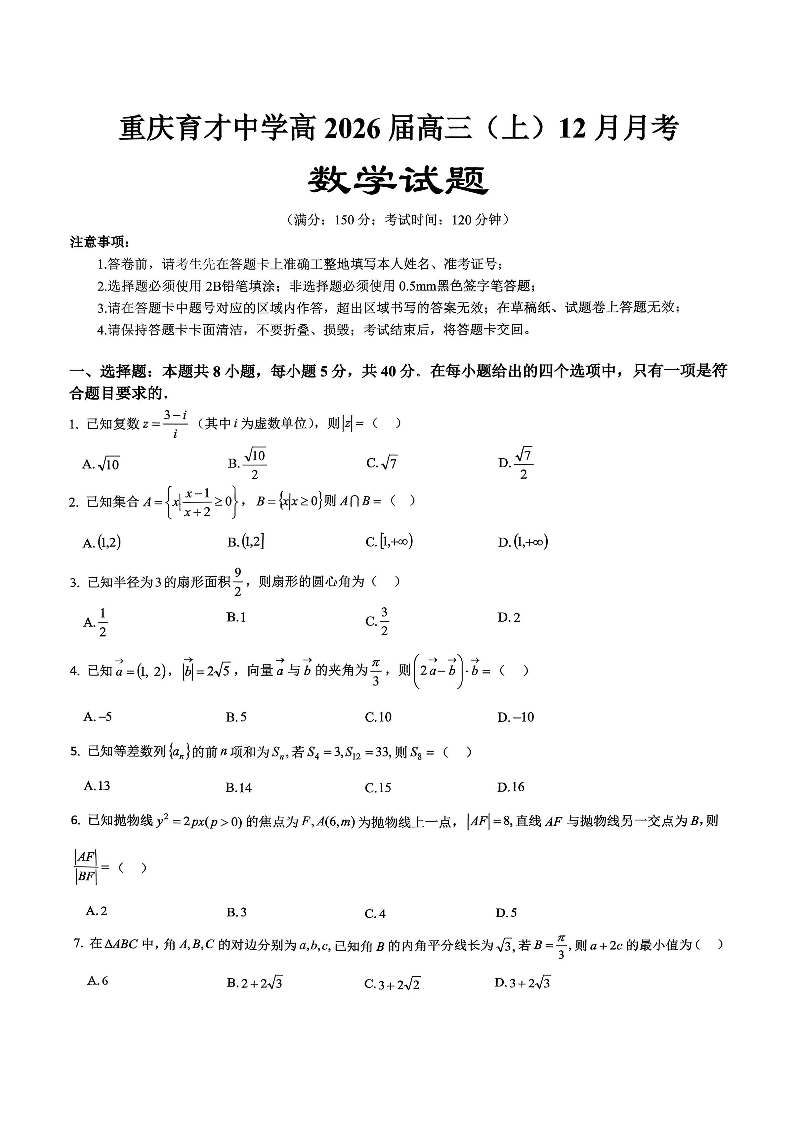 重庆育才中学高2026届高三(上)12月月考 数学.pdf