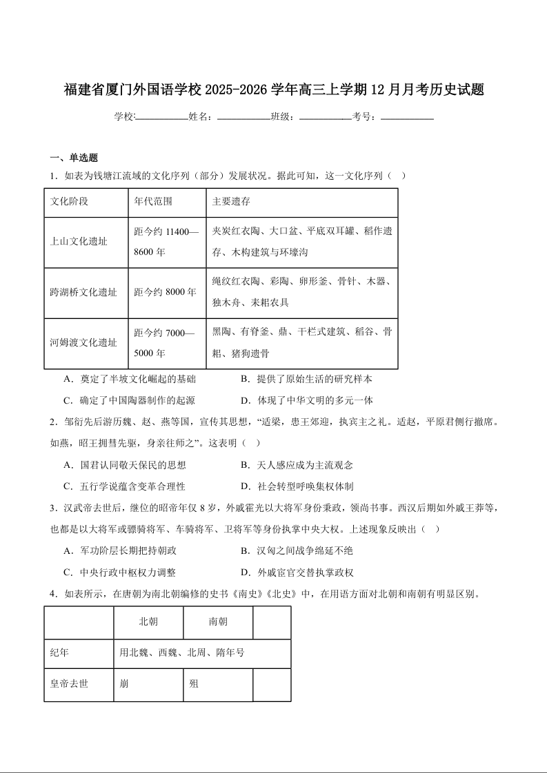 厦门外国语学校2025-2026学年高三第一学期12月月考 历史.docx