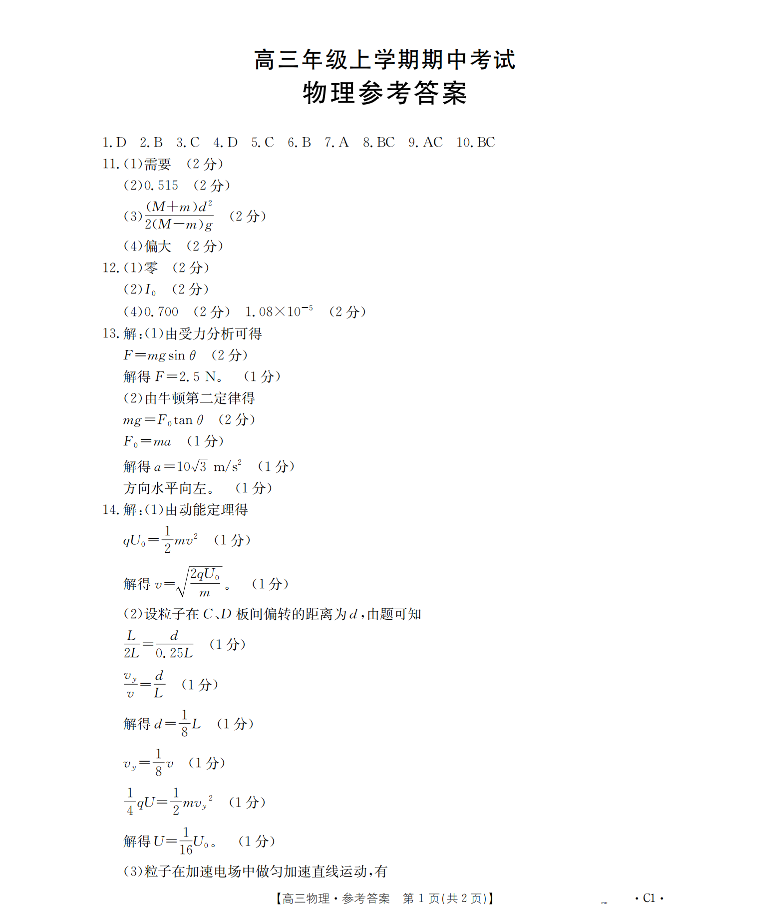河北省2026届高三年级上学期期中考试 物理答案.pdf